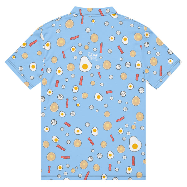 From those early tee times where a second swing feels necessary, to evening tournaments that are a little too strict on mulligans, this polo has your back. With its eye-catching scatter of bacon, eggs, pancakes, and golf balls, you’ll turn heads on the course, and who knows, maybe they’ll like your shirt enough to let you hit that extra ball.
